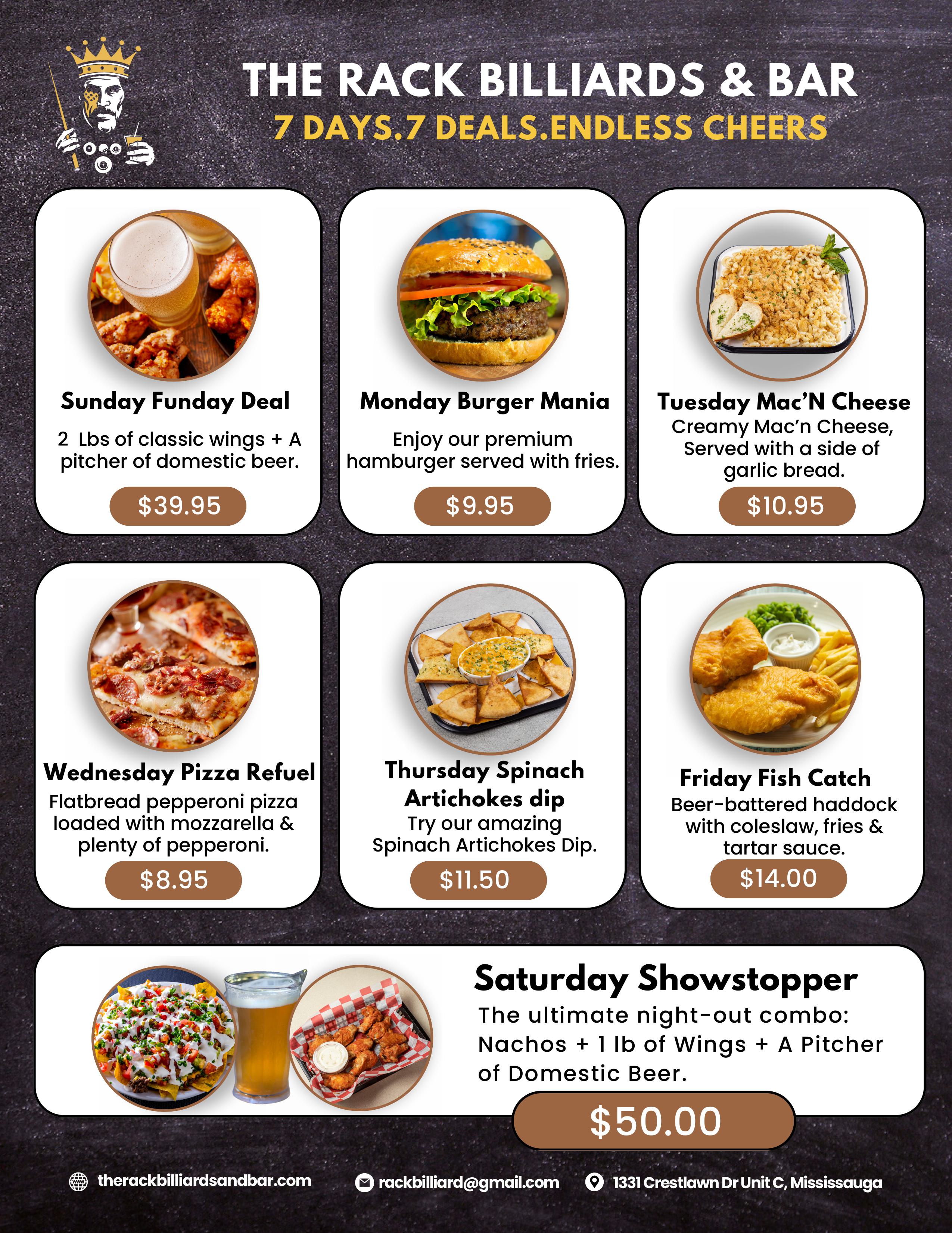 Check out what’s cooking each day of the week below and join us at 1331 Crestlawn Drive, Mississauga for great deals, good vibes, and unforgettable flavors.